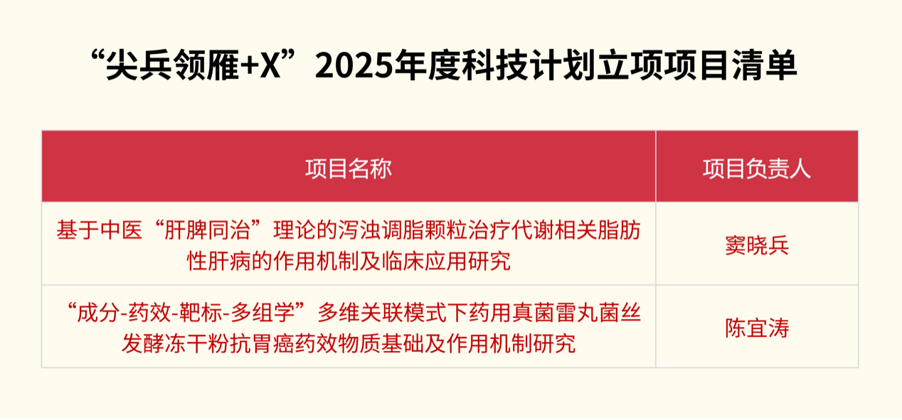 近日,浙江省科技厅发布2025年度“尖兵领雁+X”科技计划项目立项通知,MK体育牵头的2个项目上榜!中药创新药物研究—基于中医“肝脾同治”理论的泻浊调脂颗粒治疗代谢相关脂...