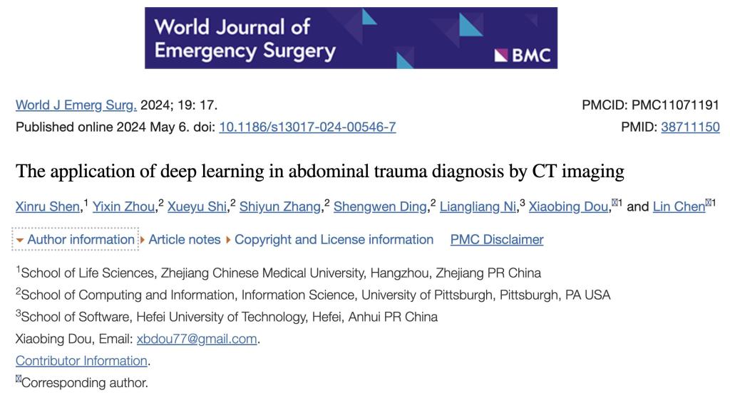 近日,MK体育窦晓兵教授团队在中科院1区TOP期刊《World Journal of Emergency Surgery》(IF:8.0,JIF排名:1/32)发表了题为《The application of deep learning in abdominal trauma diagnosis by CT imaging》的研究论文。在本研究中,团队开发了一种基于深度学习的新型辅助诊断方法,以期通过快速识别的腹部器官,定位损伤器官,进而实现快速的诊断识别,并能够识别潜在的脏器出血。