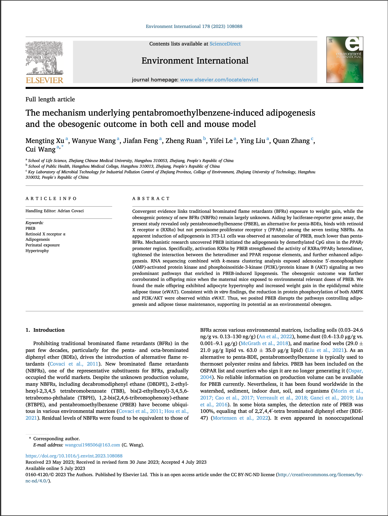 论文《The mechanism underlying pentabromoethylbenzene-induced adipogenesis and the obesogenic outcome in both cell and mouse model》通讯作者为MK体育王萃,第一作者为研究生徐梦婷。