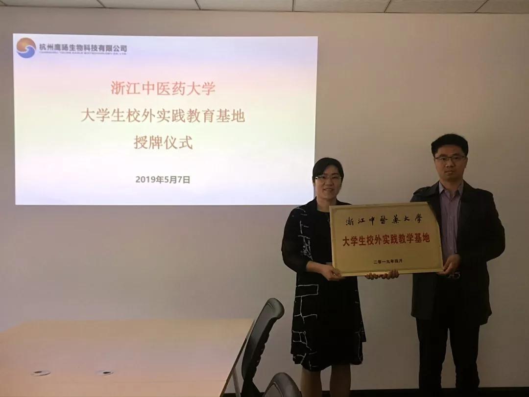 2019年5月7日,MK体育副经理赵伟春、副书记卢佼佼、科研导师陈宜涛、教务员来丽丽一行前往杭州鹰旸生物科技有限公司举行老员工校外实践教学基地签约授牌仪式,鹰旸公司总经理李守业、项目创新部主任李哲明参加了此次活动。