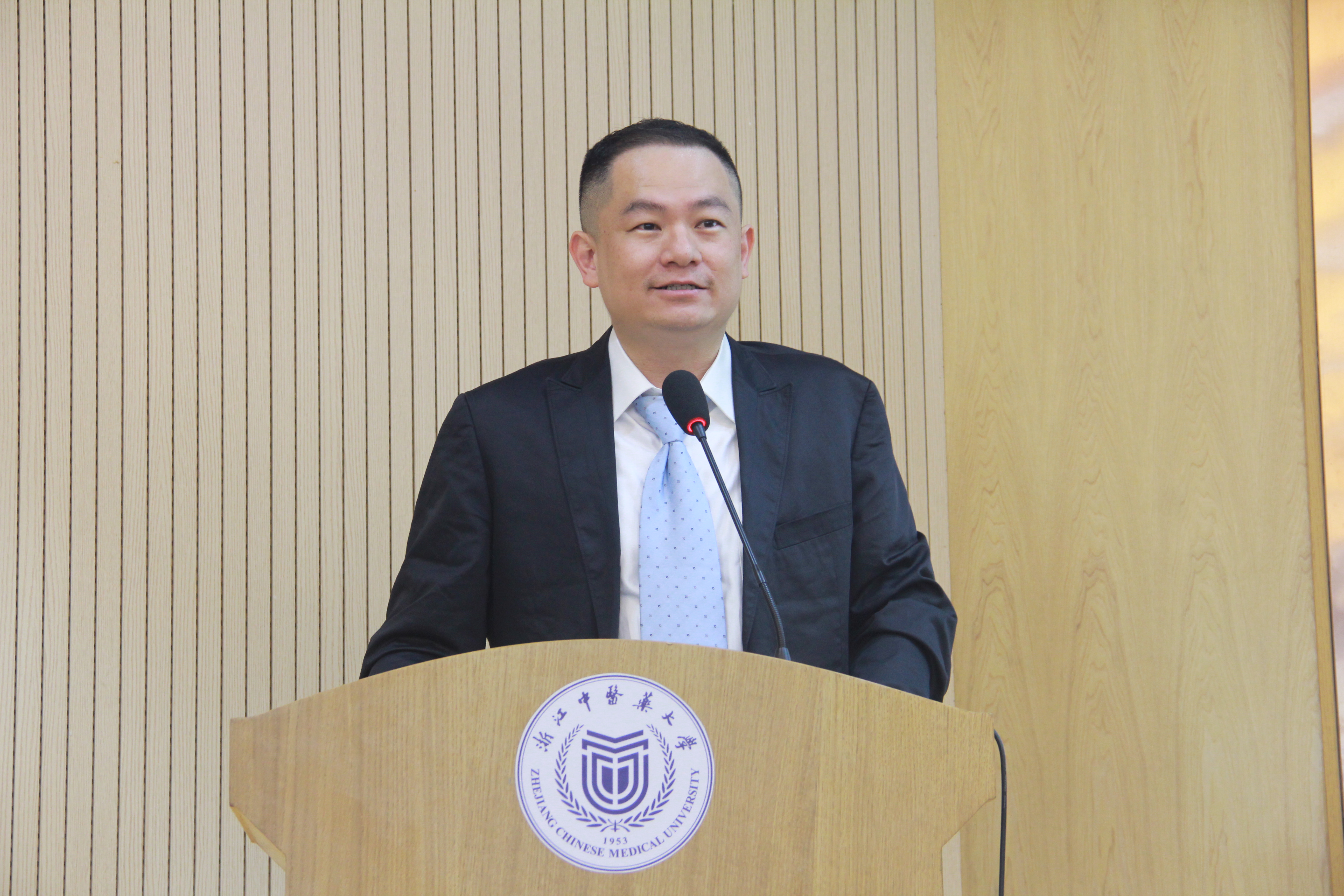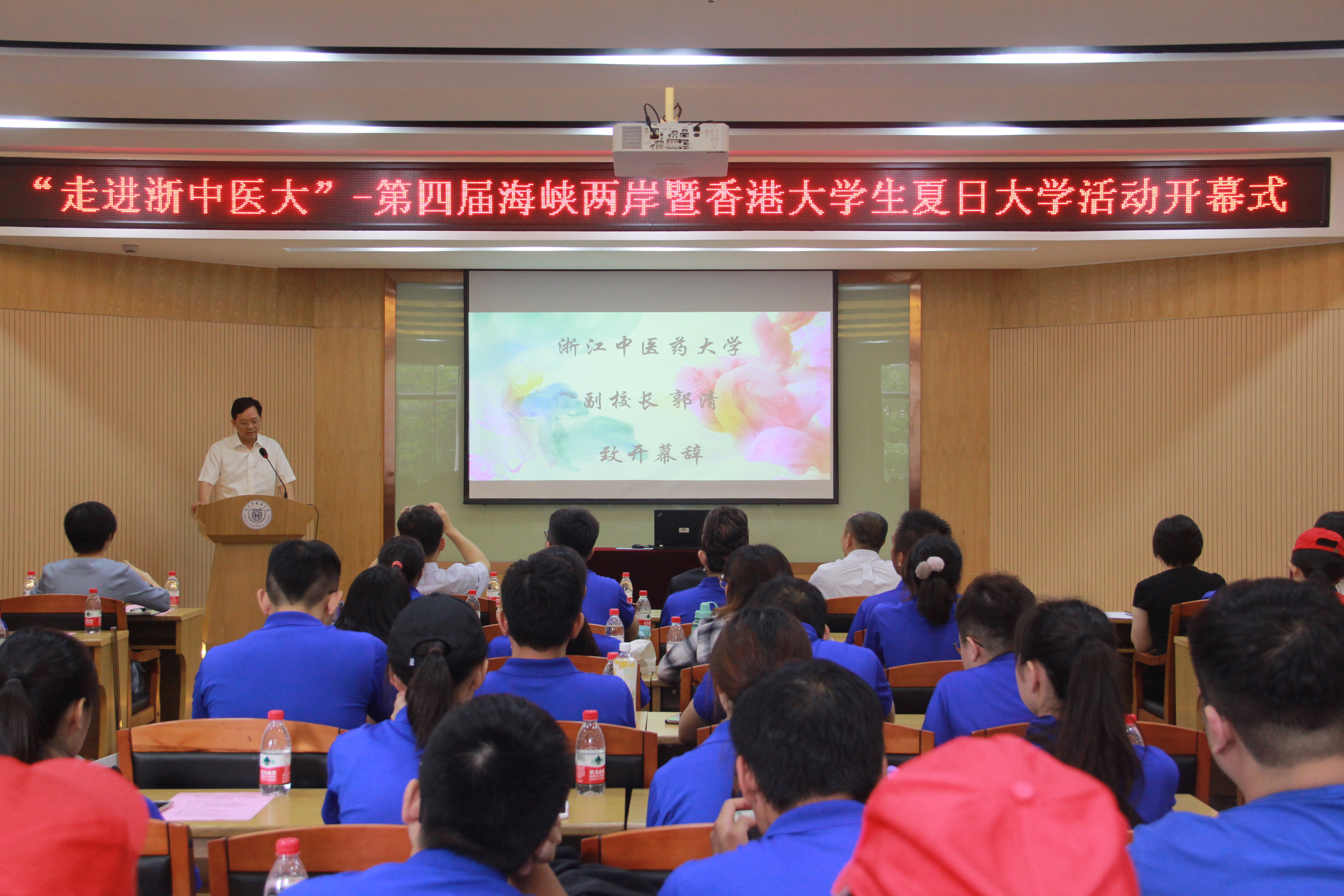 郭清副董事长致开幕辞,他介绍了杭州近几年的发展、公司的办学历史、办学特色和对台港澳交流情况,特别指出中医药是中国文化的重要组成部分,希望来自台湾和香港的同学能够以中医药文化为载体了解和认识同根同源的大陆和祖国文化。