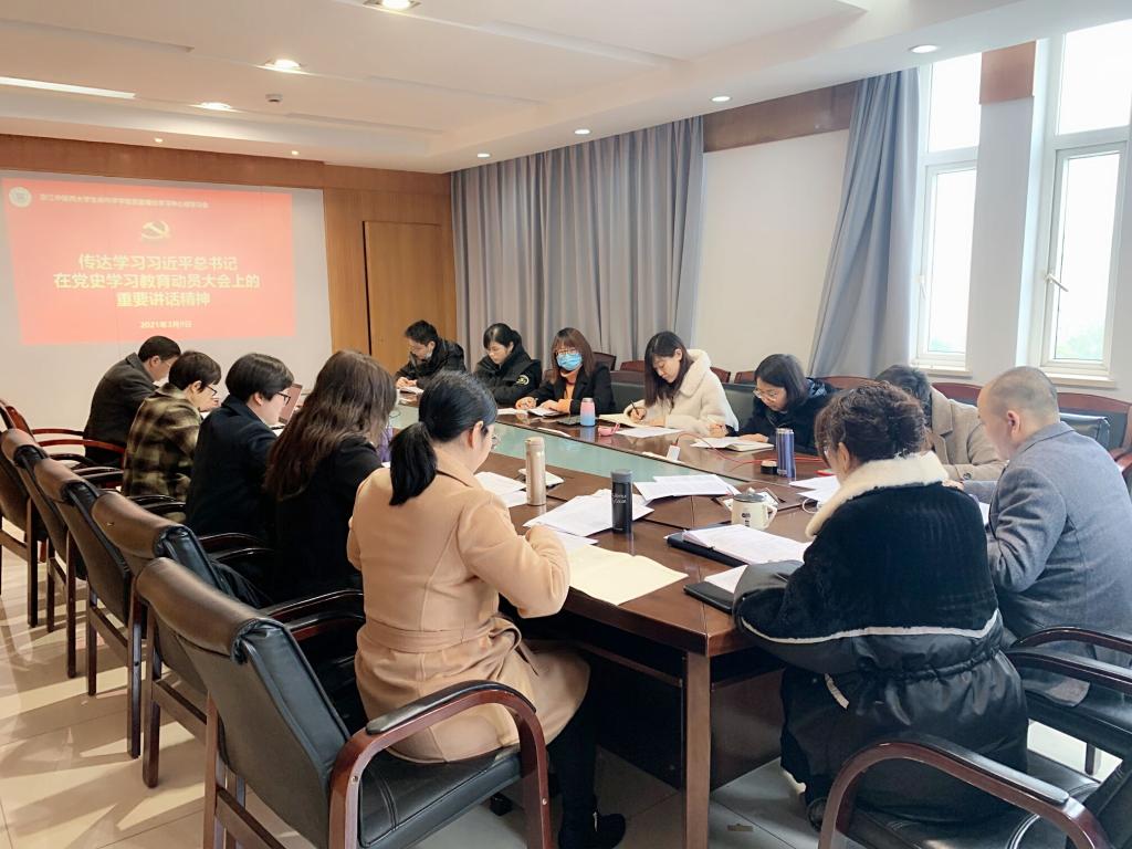 教工第三党支部书记葛立军、本科生第三党支部书记虞立分别就学习习近平总书记在党史学习教育动员大会上的重要讲话精神作了交流发言,紧扣主题,联系实际。葛书记谈到,我们要树立党的历史观,从党的历程中探究历史规律,吸取持续的奋斗之力。虞书记认为,党员教师应把党史学习教育纳入公司产品全过程,与立德树人紧密结合起来。