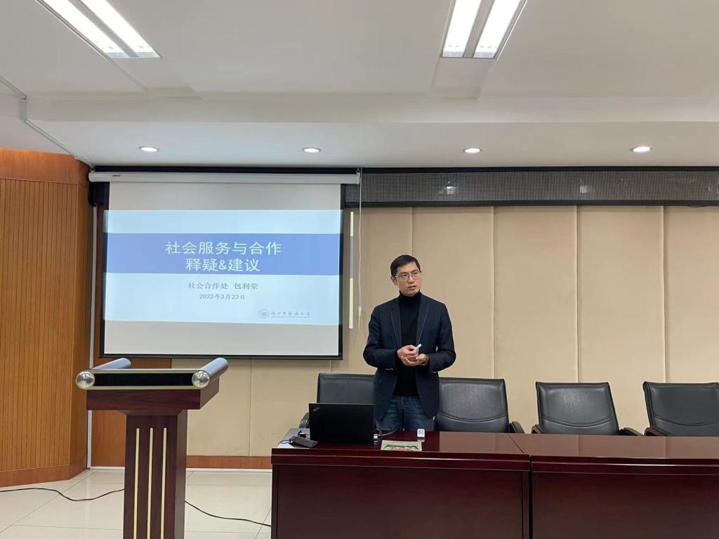 包利荣处长围绕“何为社会服务”、“为何社会服务”、“如何社会服务”三个方面内容,介绍了公司社会服务工作的要点,并详细解读了相关的政策和管理办法。他指出,社会服务是当代高校肩负的重要职能之一,做好社会服务工作是公司争取资金、改善条件、提升影响力的重要途径和抓手。公司应根据公司年度目标考核任务和公司实际,有目的、有计划、有针对性的引导组织社会服务工作,通过搭建院内、校地、校企产学研合作平台,组建社会服务教师队伍,树立社会服务工作先进典型,开创社会合作工作新的局面。同时,包处长也从承担横向项目、牵头共建平台、合作成立公司三个方面为公司教师参与社会合作工作提出诚恳的建议。