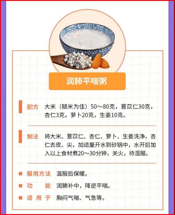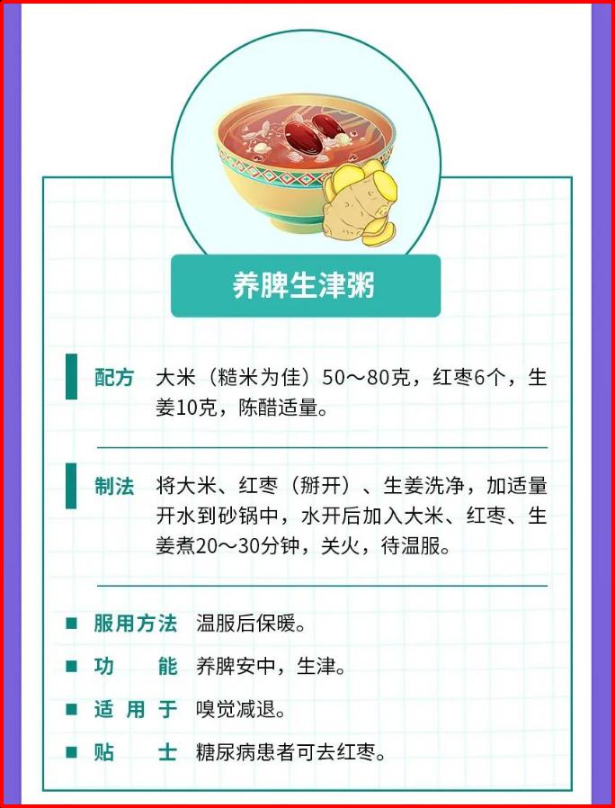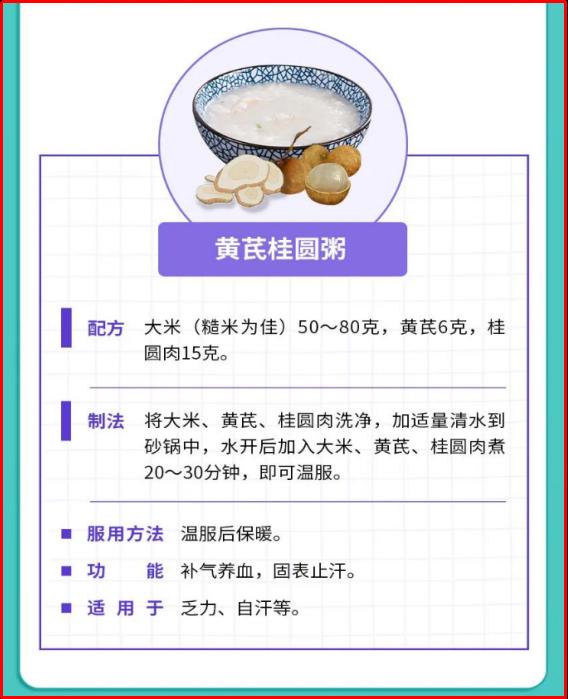 窦晓兵教授团队以药食同源理论为依据,根据食材属性和新冠感染者康复期的症状,针对性总结了缓解腹泻的培土和气粥,缓解胸闷气喘的润肺平喘粥,针对乏力、自汗的黄芪桂圆粥,缓解失眠的小米莲子粥,缓解全身疼痛的解表健和粥和针对嗅觉味觉下降的养脾生津粥等六个粥谱。