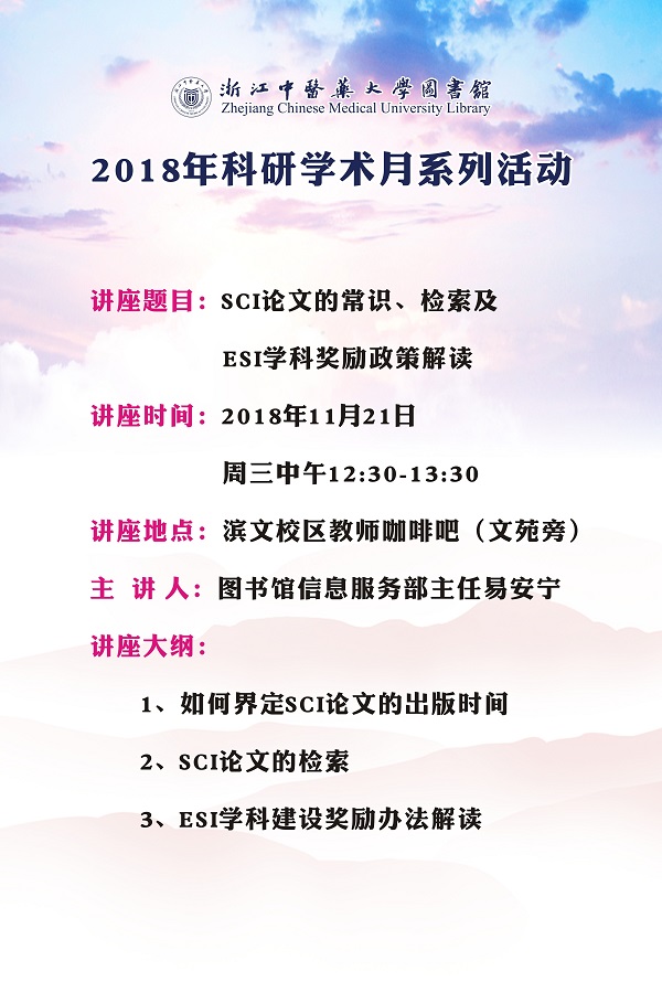 2018年科研学术月讲座预告:SCI论文的常识、检索及ESI学科奖励政策解读