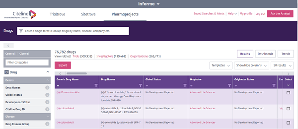 Pharmaprojects数据库是Informa集团BI部门核心数据库,是国际药物研制开发的商业智能资源,它监控着国际上处于开发过程中的每一个重要新药,跟踪着国际上处于研究发展活跃阶段的候选药物,提供医药界研究人员新产品开发的全面资料。无论是高等院校还是科研机构及企业,在审报研究课题,审议开发新药及生产新药可行性报告时Pharmaproject数据库有着重要的参考价值。Pharmaprojects是业内历史最优秀及最有声望的药物数据库之一。